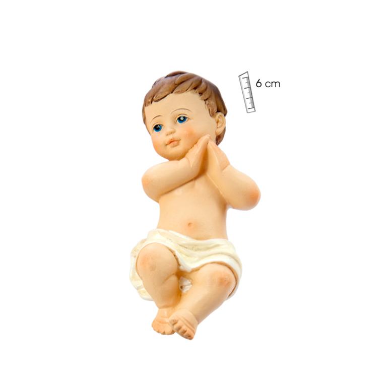 Figura del Nen Jesús amb mans juntes, aurèola daurada, 10 cm. Figura del Nen Jesús mida petita per col·locar a la tauleta o per col·locar en un pessebre.