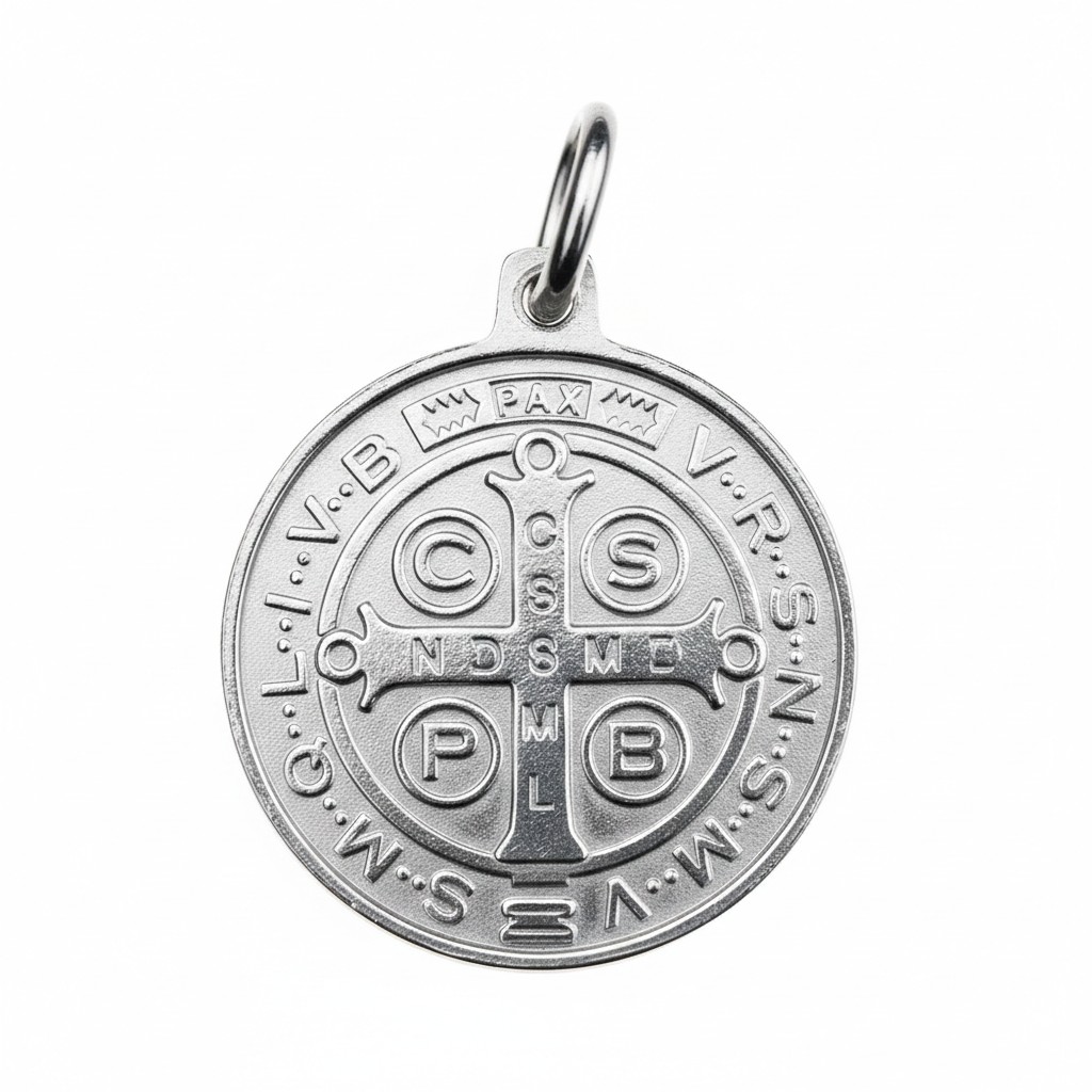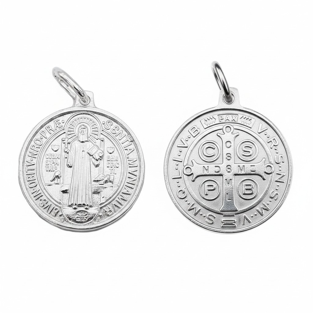 San Benito fue el primer exorcista de la historia y es conocido por haber luchado contra el demonio y el mal. Es un Santo mundialmente conocido por ser el Patrón de Europa. Sobre el anverso de la medalla está grabado el Santo con una cruz en la mano derecha como signo de exaltación al amor de Cristo y en la mano izquierda el Libro de la Santa Regla que el mismo escribió como iniciador de la vida monástica. La oración de la buena muerte rodea la figura del Santo: Eius in obitu nostro praesentia muniamur (A la hora de nuestra muerte seamos protegidos por su presencia), pues San Benito es el Patrón de la buena muerte, junto San José. En el fondo de la imagen aparece la frase Crux sancti patris Benedicti (Cruz del Santo Padre Benito), junto con una copa y un cuervo que significa las veces que lo intentaron sacrificar y se salvó. En el anverso de la medalla se encuentra la cruz de San Benito donde están escritas varias iniciales.