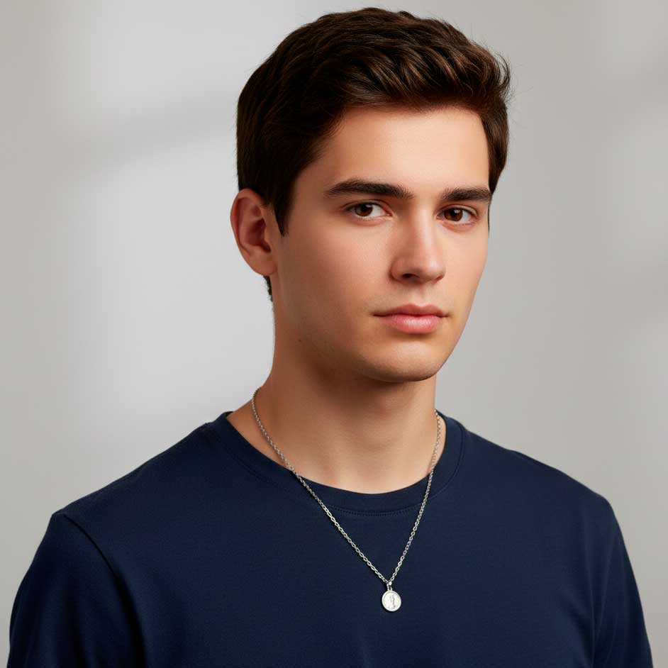 Colgante Medalla Papa León XIV, plata 925, dos modelos. Esta medalla de 1 cm de diámetro constituye una pieza de orfebrería de carácter devocional realizada en plata de primera ley (925 milésimas), disponible tanto en su versión íntegramente en plata como en una variante en plata de primera ley con baño de oro. Su reducido formato no menoscaba la precisión técnica ni la riqueza simbólica que la caracterizan, sino que, por el contrario, pone de relieve la destreza en el trabajo minucioso del metal noble.