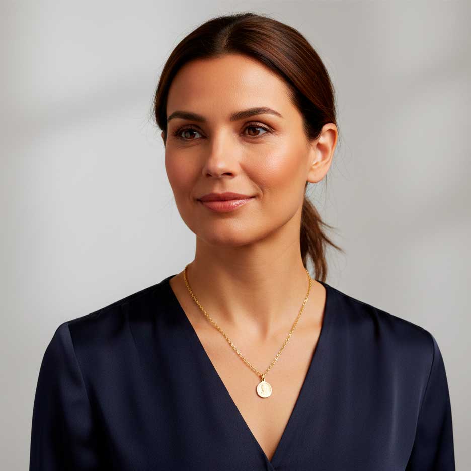 El canto presenta un perfil pulido que contrasta con la superficie ligeramente matizada del fondo, generando un juego de luces que acentúa el relieve del retrato. La anilla superior, integrada de manera funcional y estética, permite su uso como colgante, facilitando su incorporación a cadenas finas o rosarios, así como su empleo en contextos litúrgicos o de devoción personal.