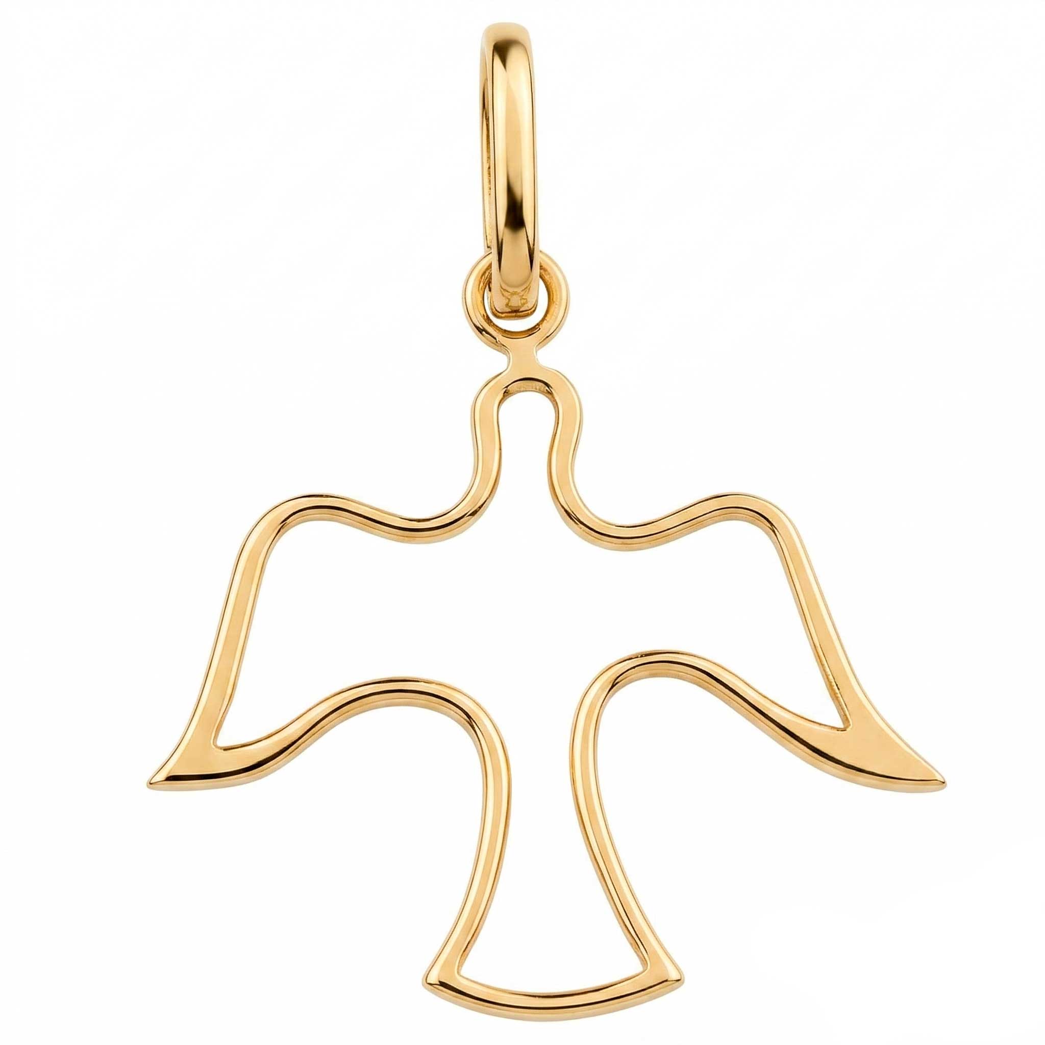 Colgante medalla, silueta paloma Espíritu Santo, oro 18K. Colgante silueta paloma Espíritu Santo en oro de 18K (1,30 g). Esta joya destaca por su diseño minimalista y contemporáneo, donde la figura de la paloma se traza mediante una delicada línea continua que aporta ligereza visual y elegancia. Sus formas suaves y equilibradas evocan armonía y serenidad, convirtiéndolo en un accesorio con una fuerte carga simbólica y estética.