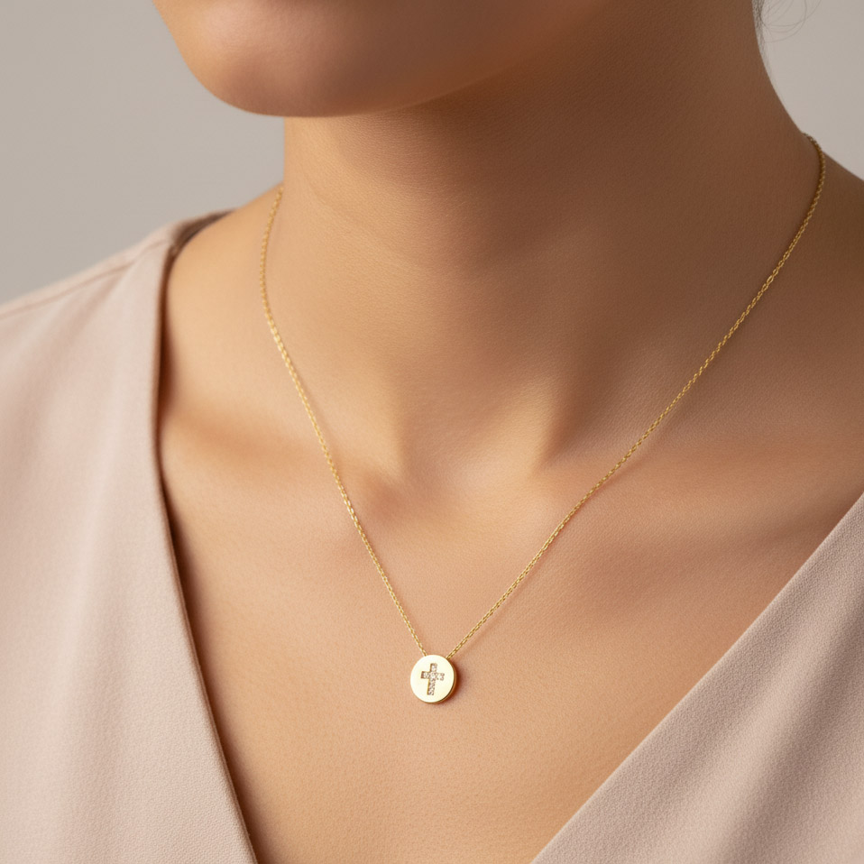 Medida: ajustable de 40 cm a 45 cm, medalla: 0,9 cm de diámetro | Material: plata 925 con baño de oro y cruz con circonitas | Procedencia: Italia