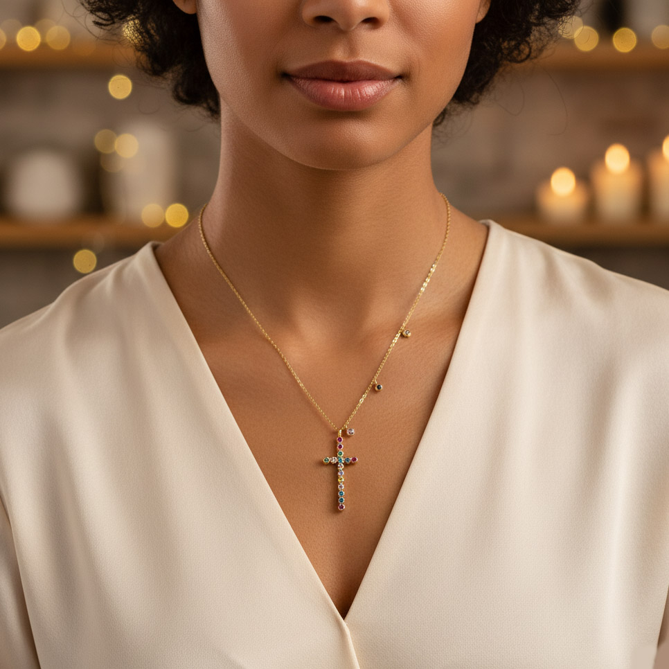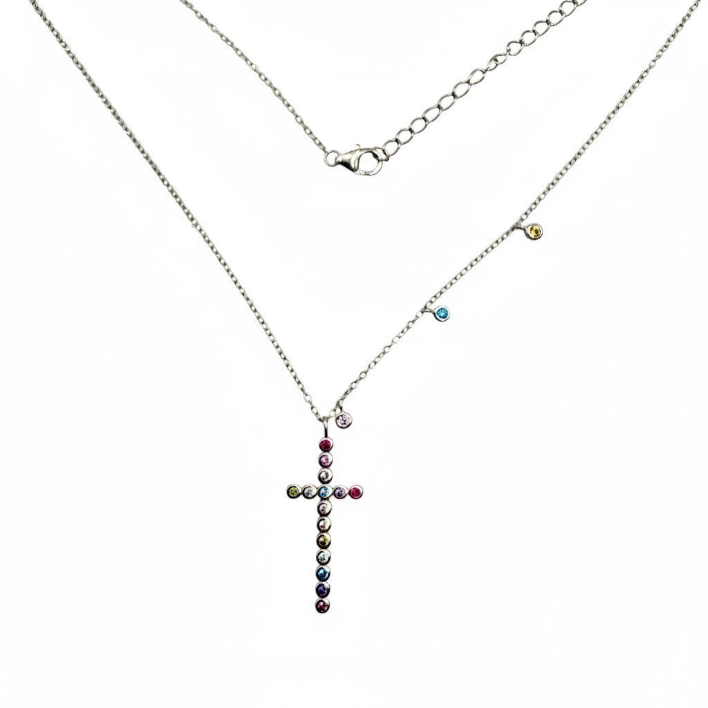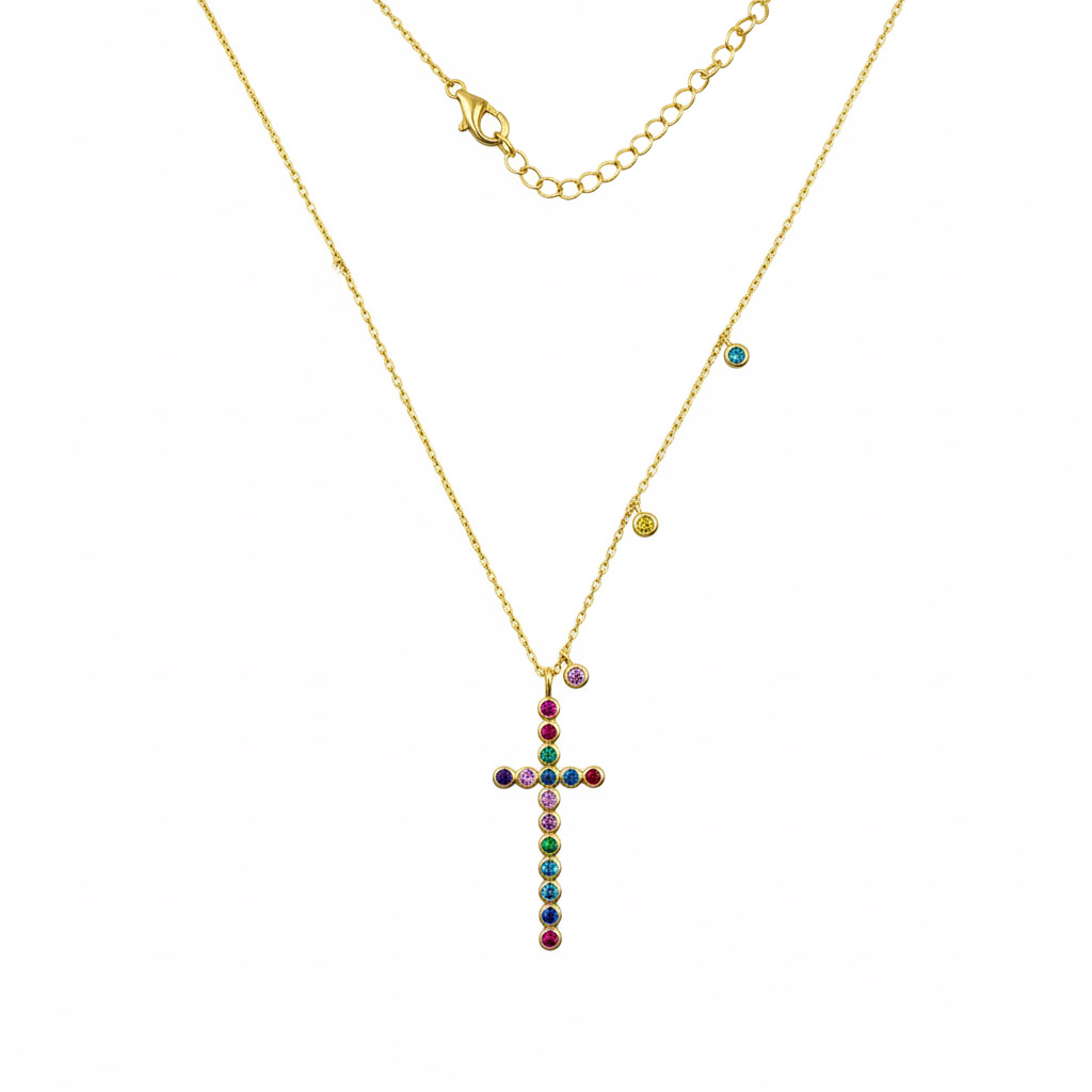 Medida: cruz 3 cm, diámetro cadena ajustable de 32 cm a 42 cm | Material: Plata 925 y plata 925 con baño de oro, circonitas | Procedencia: España