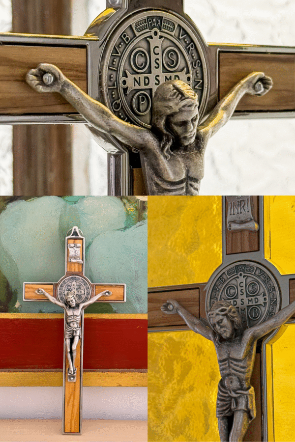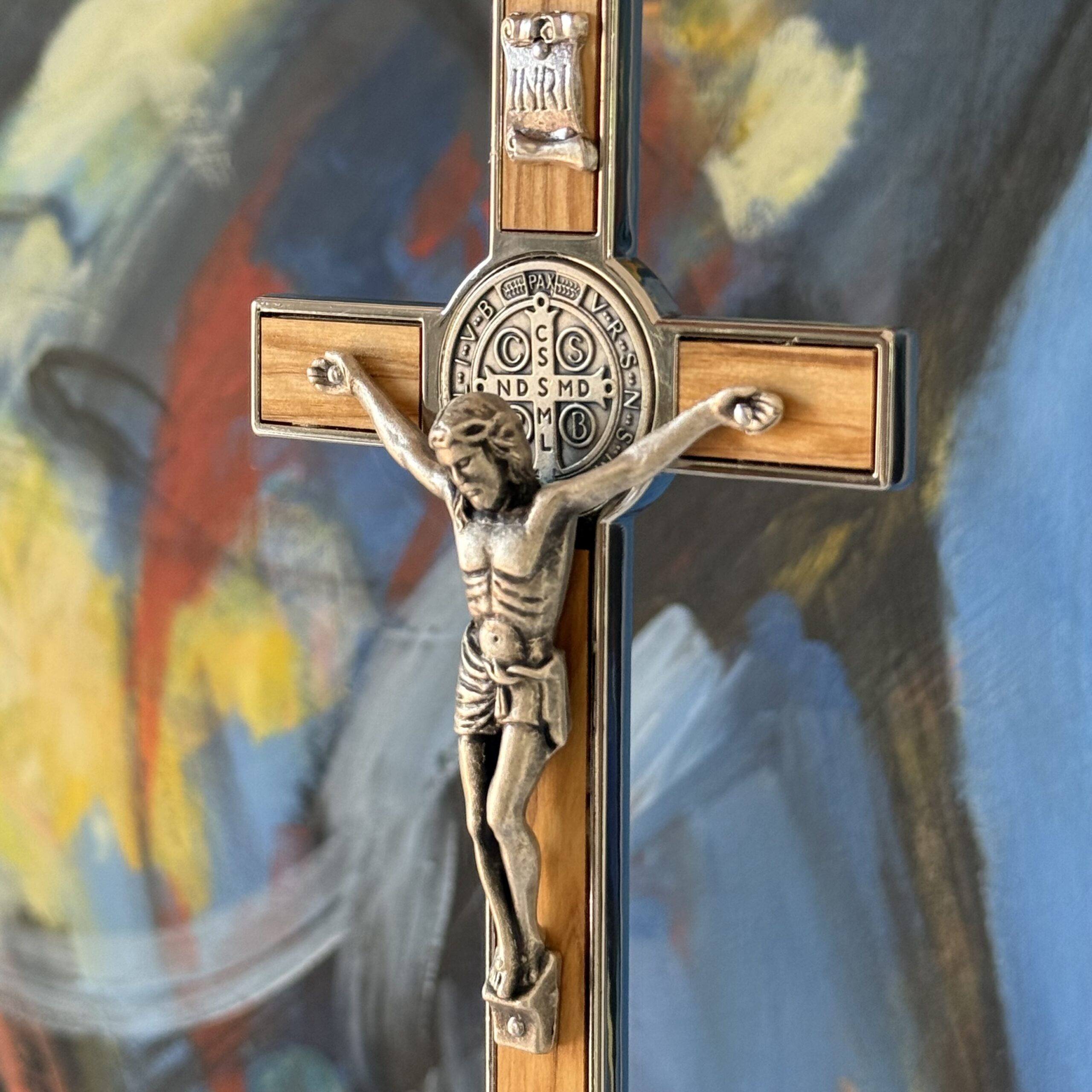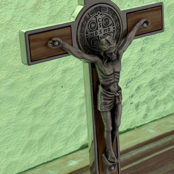 Crucifijo de pared elaborado en madera de olivo y metal, con la Medalla de San Benito integrada. Una pieza tradicional de devoción cristiana, pensada para la oración y la protección espiritual del hogar.