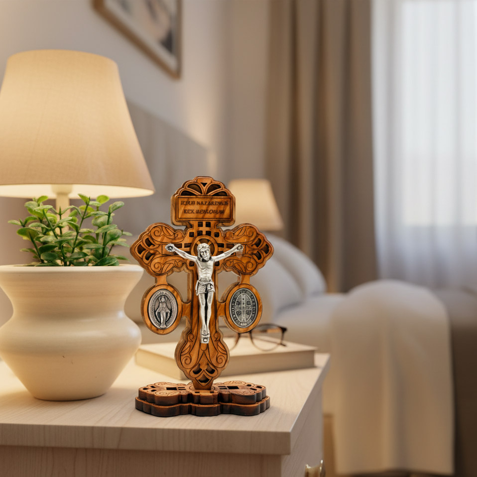 La base tallada reproduce las formas ornamentales de la cruz, reforzando la armonía estética y asegurando una sujeción firme. Su tamaño compacto la convierte en un objeto versátil y práctico, fácil de ubicar en distintos espacios.