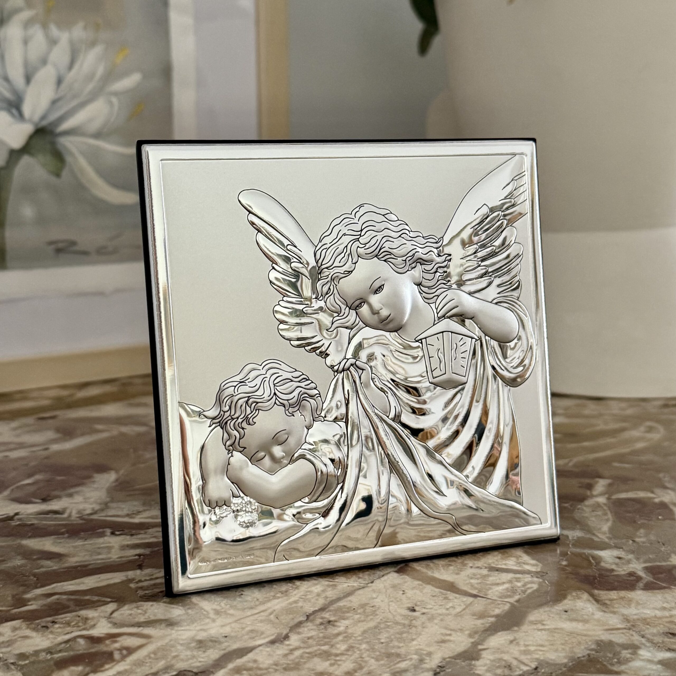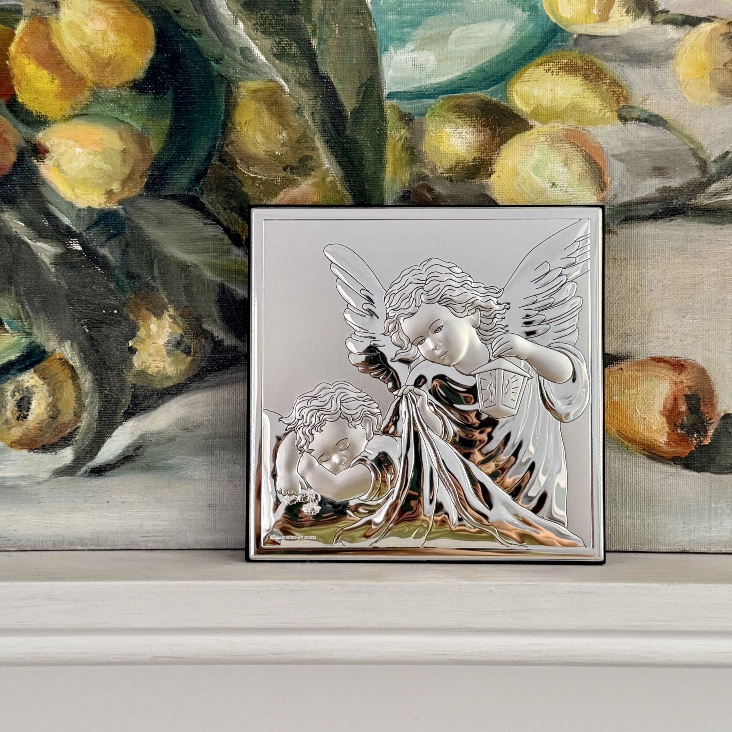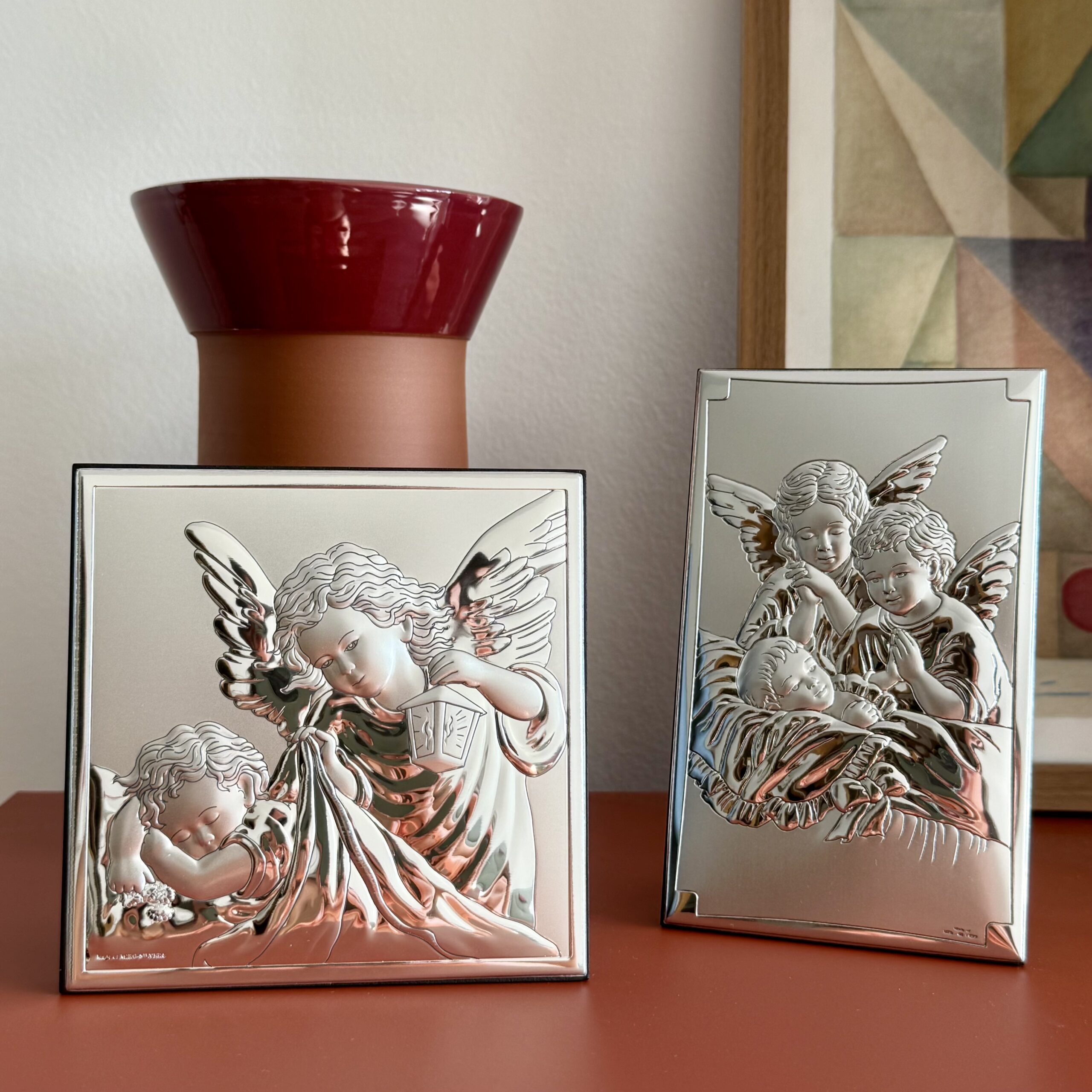 Elegantes cuadros religiosos en plata de alta pureza y madera que representan al ángel de la guarda cuidando de un niño dormido. Disponibles en formato cuadrado (12 cm x12 cm) y rectangular (15 cm x 9 cm), ambos modelos pueden colgarse o colocarse sobre una superficie. Son ideales como símbolo de protección espiritual y regalo significativo en ocasiones especiales.