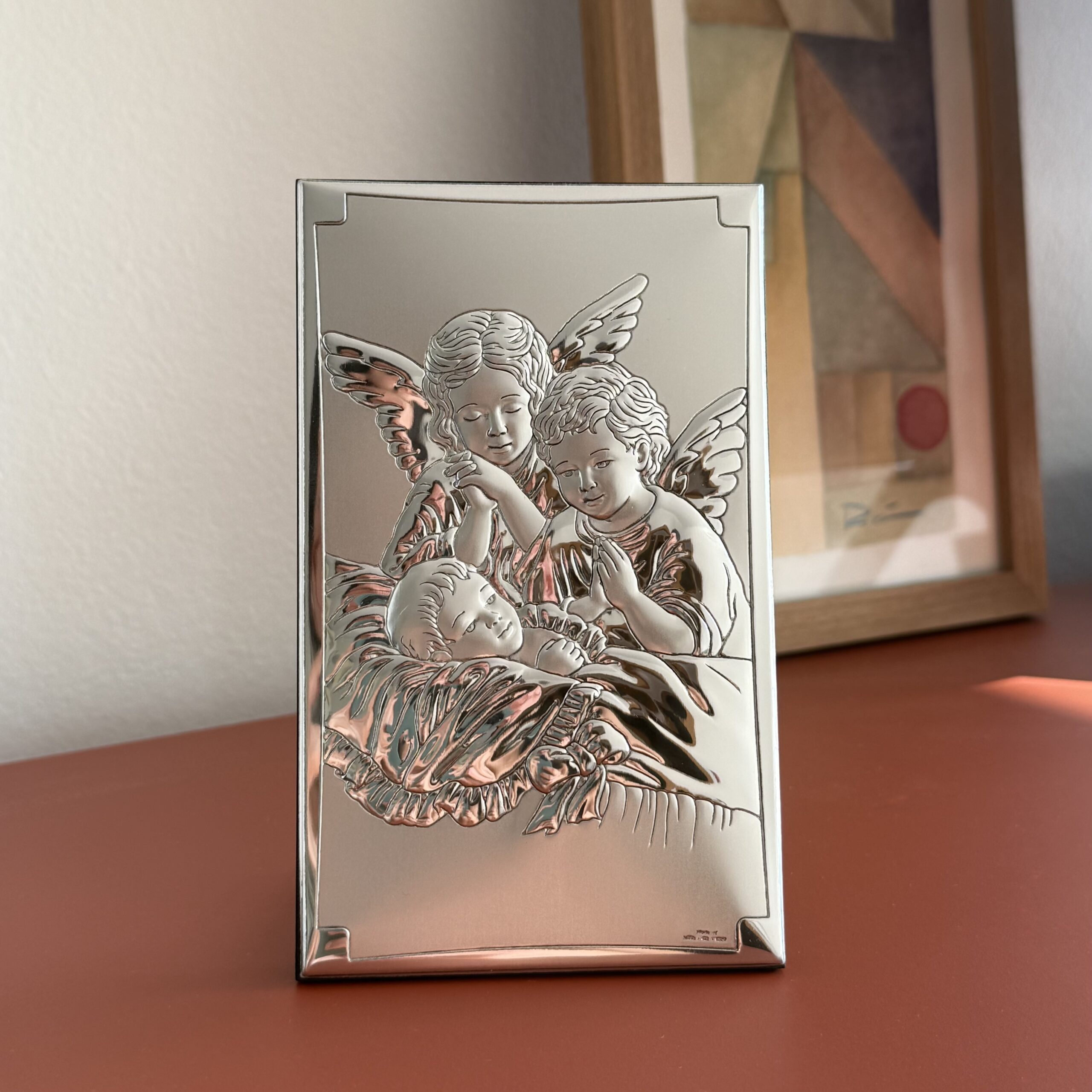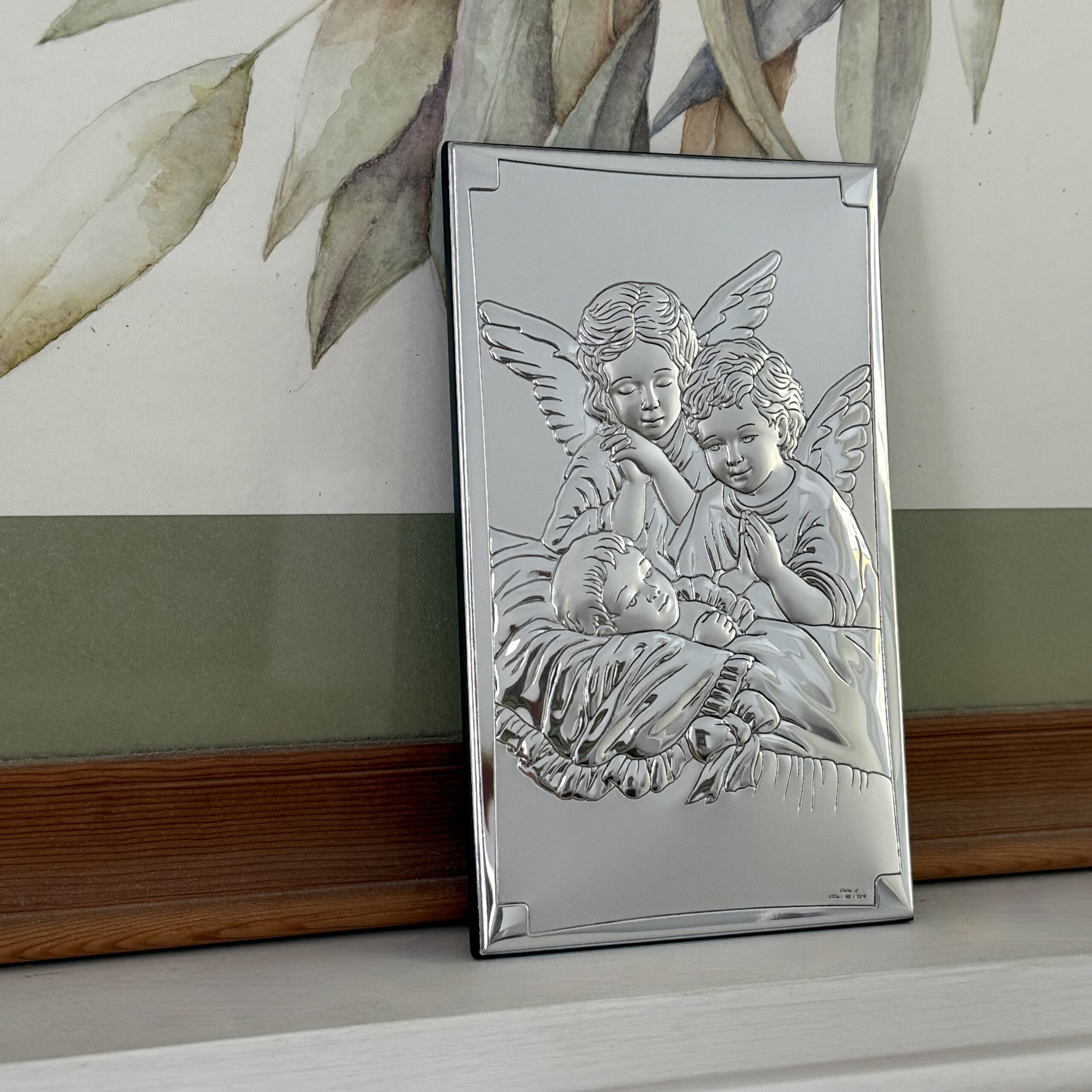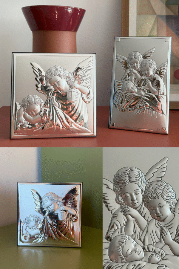 Elegantes cuadros religiosos en plata de alta pureza y madera que representan al ángel de la guarda cuidando de un niño dormido. Disponibles en formato cuadrado (12 cm x12 cm) y rectangular (15 cm x 9 cm), ambos modelos pueden colgarse o colocarse sobre una superficie. Son ideales como símbolo de protección espiritual y regalo significativo en ocasiones especiales.