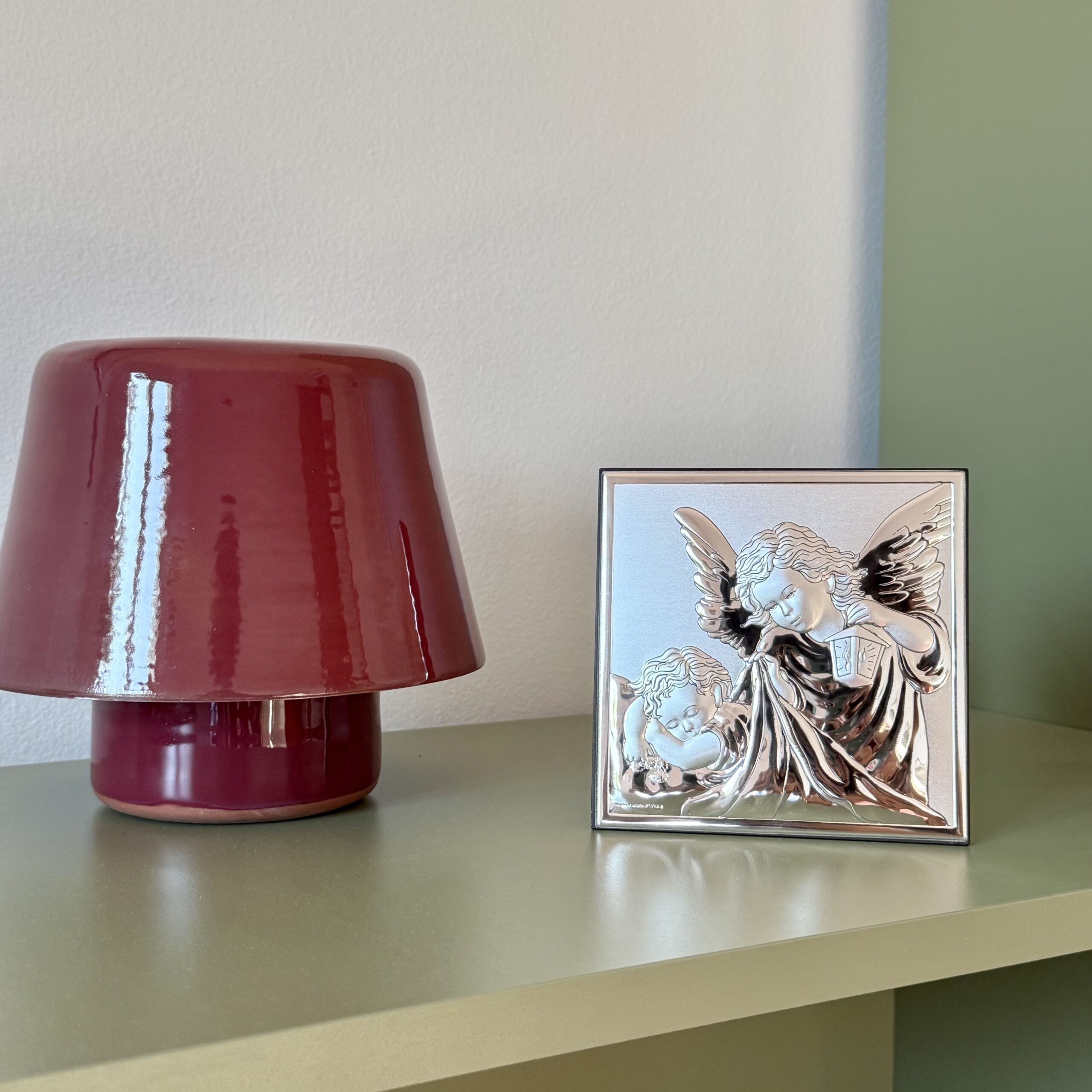 El primer modelo, de formato cuadrado (12 cm x 12 cm), muestra a un ángel alado que observa con ternura a un niño dormido. La escena evoca la vigilancia constante y amorosa del ángel custodio. El ángel sostiene una lámpara, símbolo de guía y protección en la oscuridad, mientras el niño reposa en calma, acompañado de flores en sus manos, signo de inocencia y pureza.