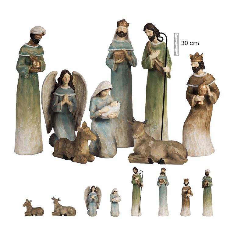 Belén de resina pintada a mano, en suaves tonos pastel y estilo tallado. Figuras de hasta 30 cm que aportan elegancia, espiritualidad y calidez a la decoración navideña del hogar. Un regalo ideal para quienes aprecian arte religioso de calidad.