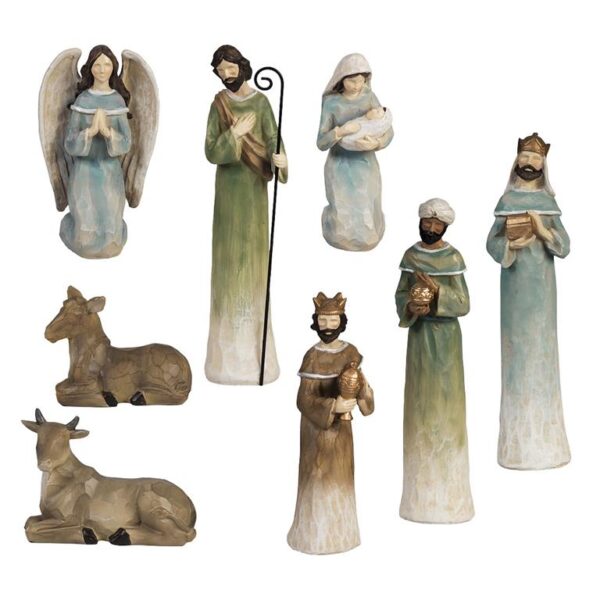 El conjunto incluye las figuras tradicionales del Nacimiento: la Virgen María sosteniendo al Niño Jesús, San José con su cayado, un ángel orante, los tres Reyes Magos con sus ofrendas, así como el buey y la mula en posición reposada. Cada pieza muestra un modelado delicado, con expresiones serenas y posturas equilibradas que transmiten un profundo sentido de recogimiento y espiritualidad. Las tonalidades suaves en azules, verdes y marrones contribuyen a generar un ambiente cálido y acogedor, ideal para el hogar.