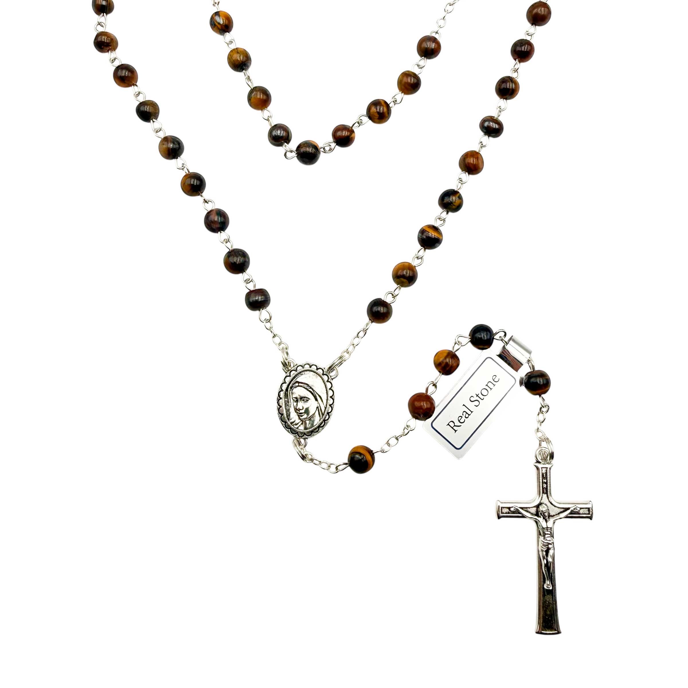 Este rosario está hecho con cincuenta cuentas de piedra de ojo de tigre de 5 mm cada una. El ojo de tigre es una gema conocida por su belleza natural. Su tonalidad dorada y rayas marrones y oscuras crean un efecto visual impresionante. El ojo de tigre es una mezcla de minerales con tonos pardos y amarillentos. Su composición incluye cuarzo como componente principal, junto con limonita y riebeckita, creando su característico aspecto rayado.